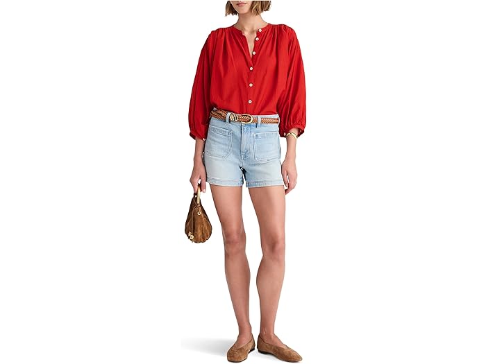 Shirred Crewneck Button-Up Top